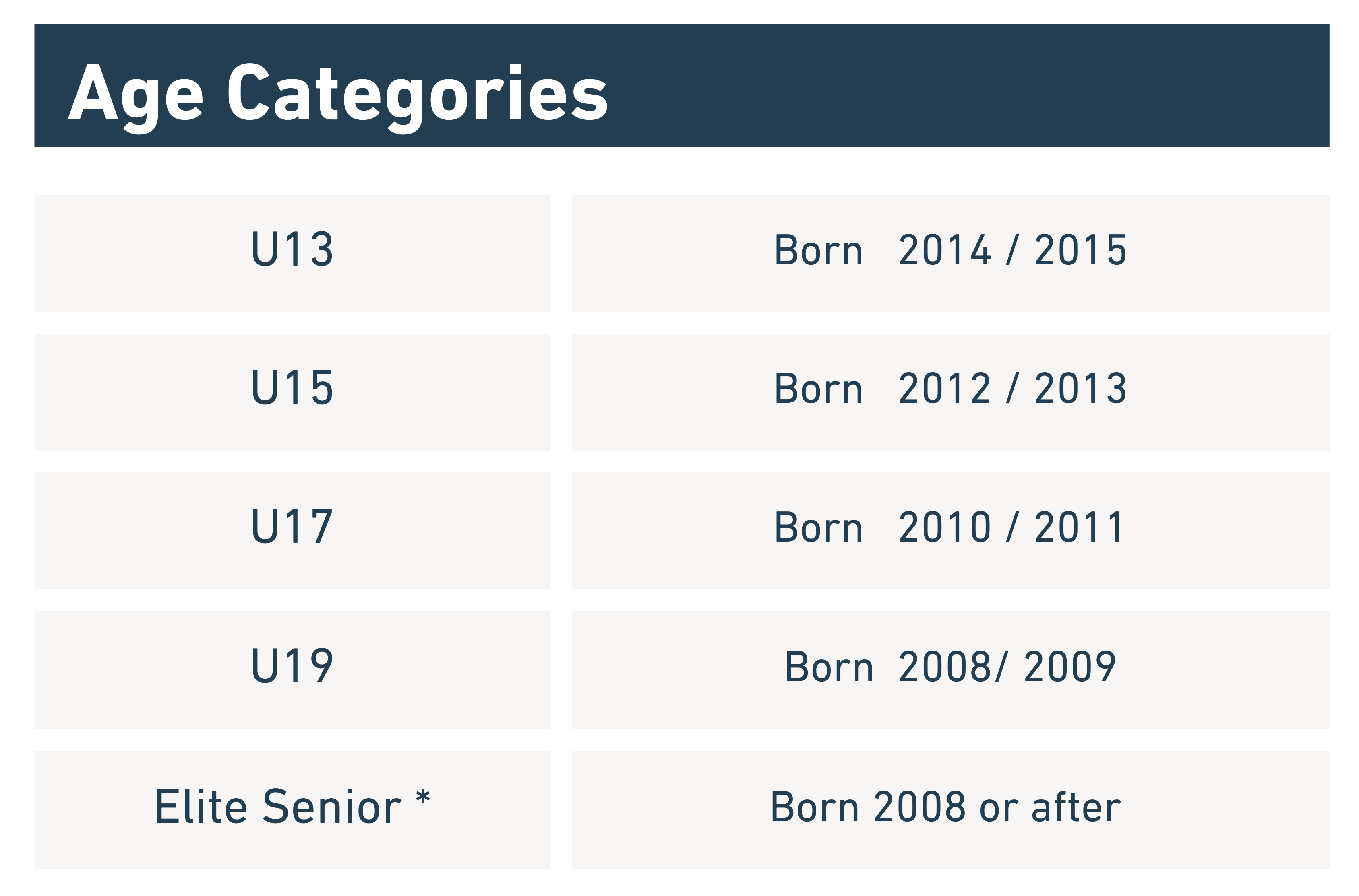 *Elite Level athletes aged 17 & 18 are eligible to compete in the Elite Senior(10-12 boulder quals) or the U19 (20 boulder quals) category. Please follow coaches advice in choosing the most suitable category and reach out if you have any questions.